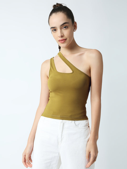 Disrupt Women Olive One-Shoulder Cut-Out Square Neck Slim Crop Top