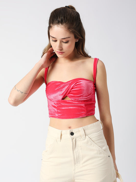 DISRUPT WOMEN PINK VELVET STRAPPY SLIM FIT TWISTED CROP TOP WITH CUPS
