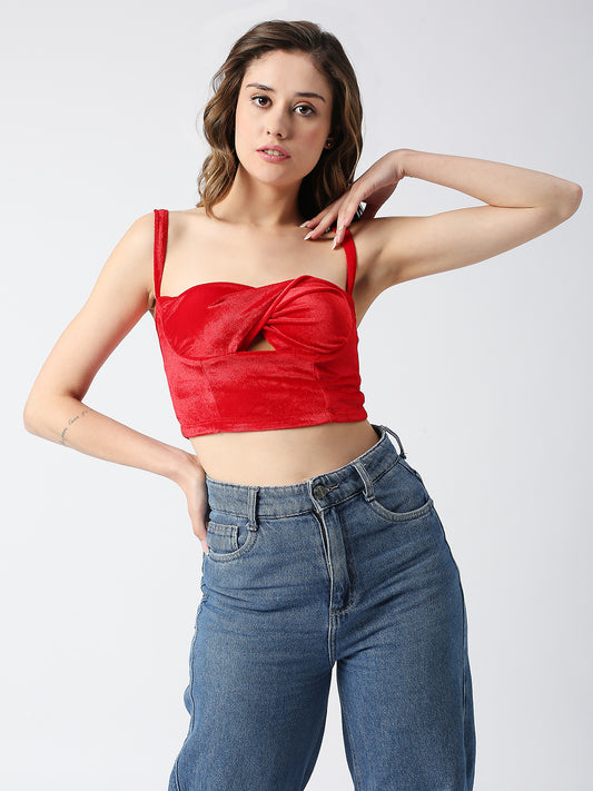 DISRUPT WOMEN RED VELVET STRAPPY SLIM FIT TWISTED CROP TOP WITH CUPS