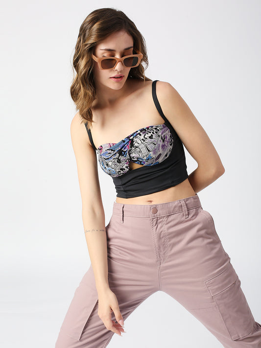 DISRUPT WOMEN BLACK ANIMAL PRINT STRAPPY SLIM FIT TWISTED CROP TOP WITH CUPS