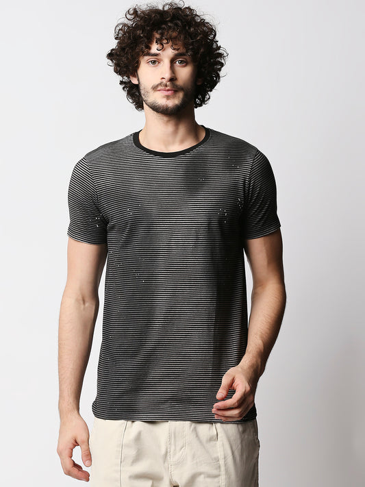 Disrupt Mens Grey Splatter Sprayed Street-style Striped T-shirt