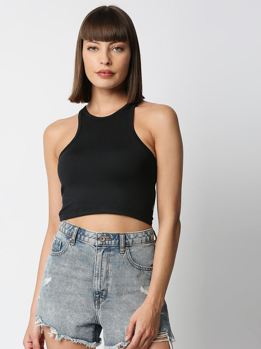Disrupt Women Black Racer Back High Neck Slim Fit Smart Crop Top