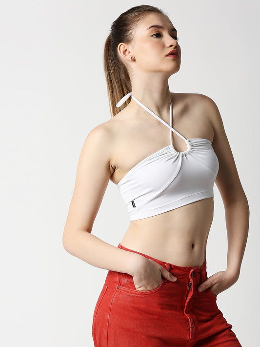 Disrupt Women White Rouched Cross Front Halter Neck Tie-Up Crop Top