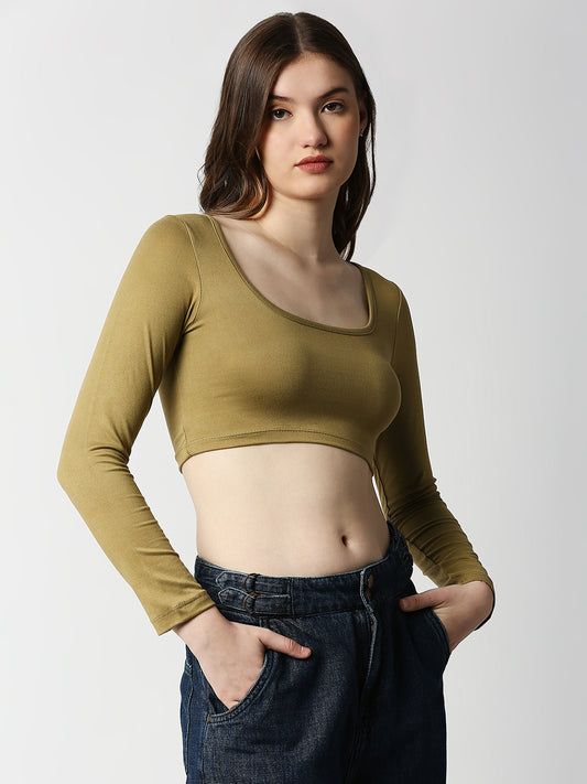 Disrupt Women Beige Classy Long Sleeve Slim Fit Crop Top