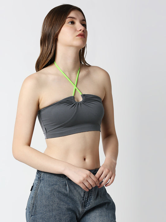 Disrupt Women Charcoal Rouched Cross Front Halter Neck Tie-Up Crop Top