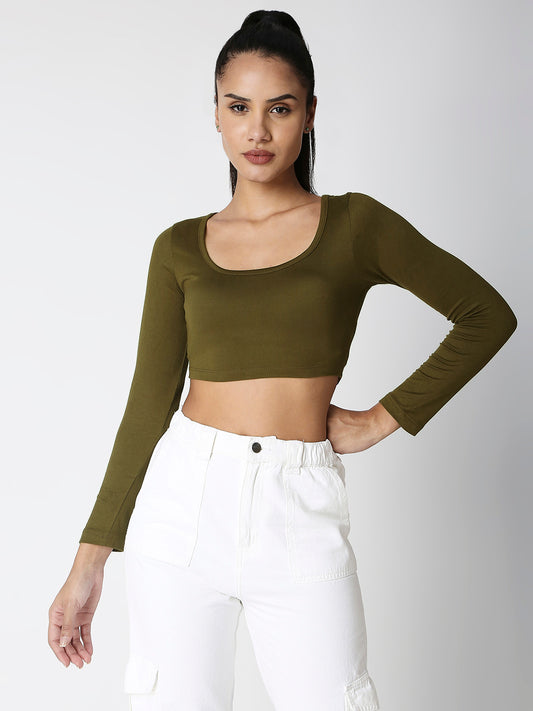 Disrupt Women Olive Classy Long Sleeve Slim Fit Crop Top