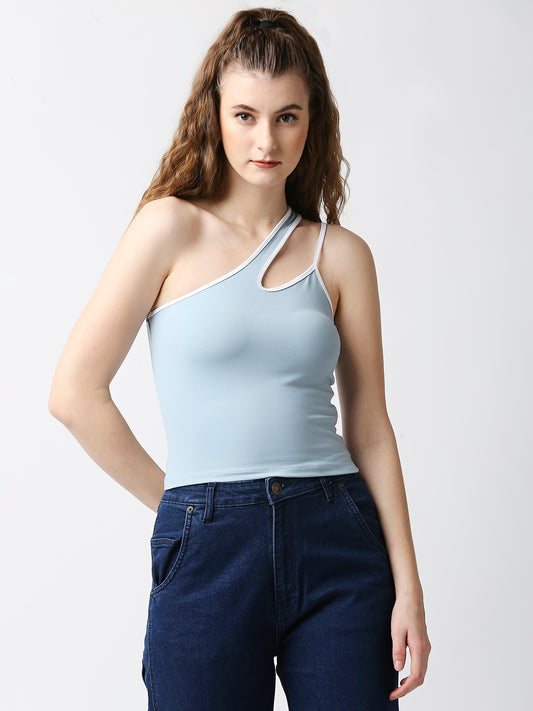 Disrupt Women Baby Blue One-Shoulder Cut-Out Spaghetti Slim Crop Top