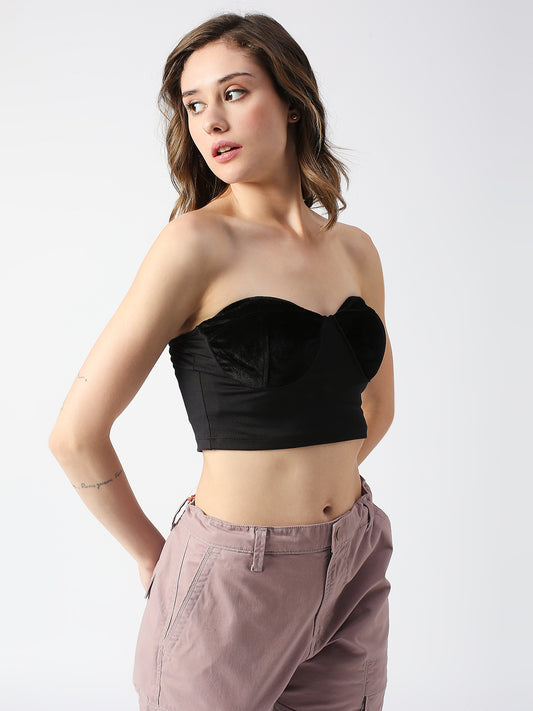 DISRUPT WOMEN BLACK VELVET PANELED SLIM FIT PADDED TUBE TOP
